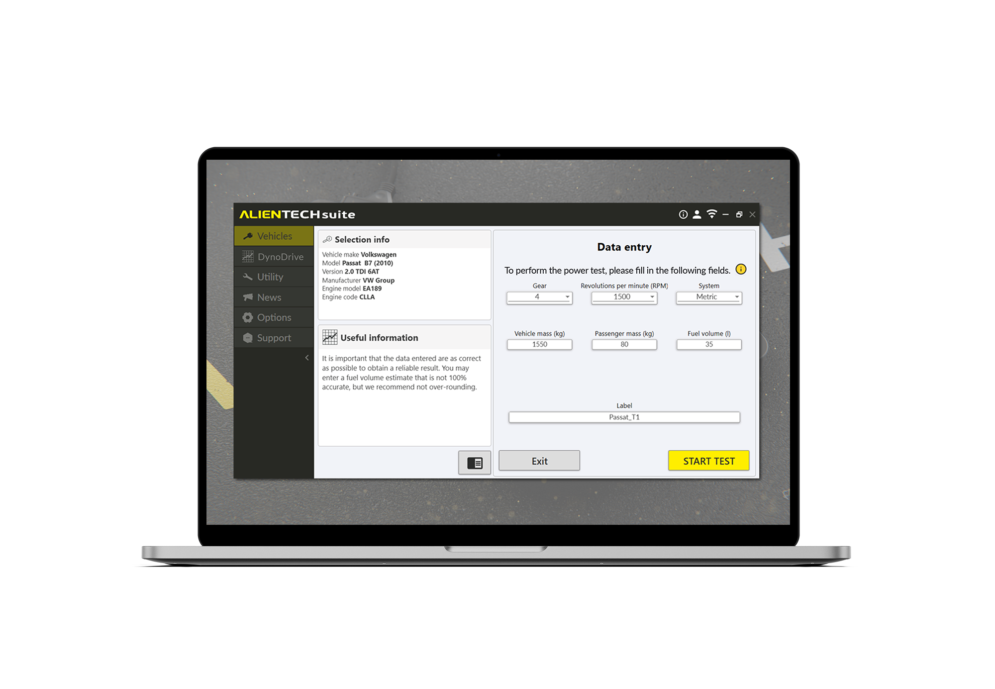 You can input vehicle data such as: vehicle and passengers’ mass (including any tools and luggage) and fuel level. Additionally, you can choose how to conduct the test by setting the starting engine RPM (1500/2000 rpm) and the gear in which you wish to perform the test (3rd/4th), to make the best use of available space and work in complete safety. All power test operations must be carried out only on a closed circuit or on a road not open to the public.
