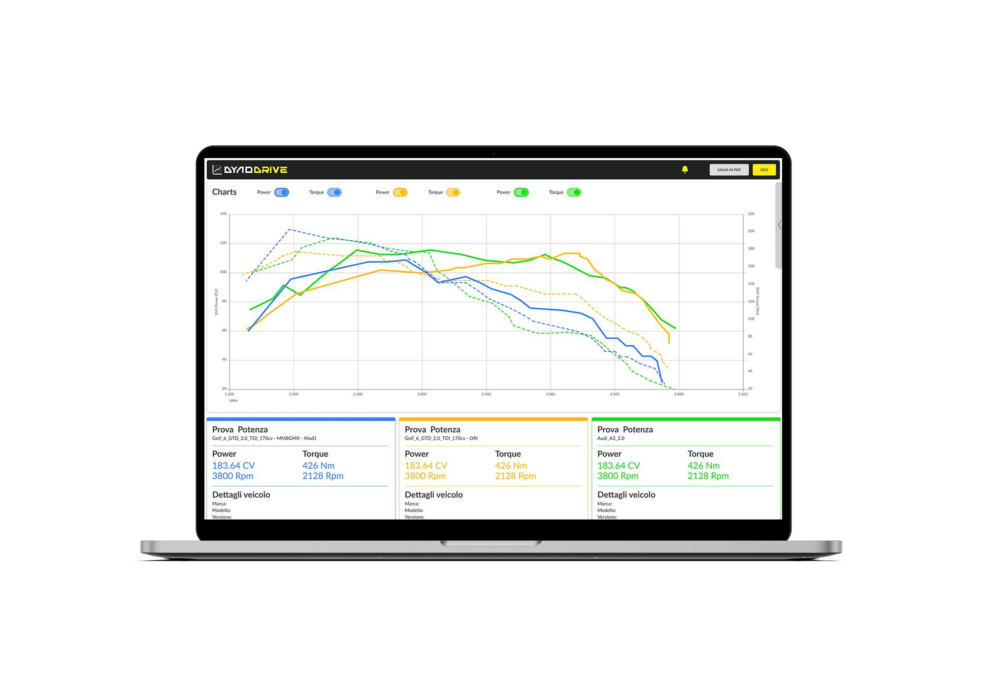 At the end of the test, the Dashboard automatically stores the torque and power values. In addition to numerical data, DynoDrive provides Cartesian graphs that can be compared by overlaying them to easily discern and compare curve differences at a glance. The software allows for comparing up to 3 tests simultaneously. To facilitate consultation, different colors and styles have been assigned to the curves of individual tests. But that's not all: the values along with the graphs recorded in Dashboard can be easily exported in a .PDF sheet, that can be shared with the customer to verify the effectiveness of the intervention or to meet their desires.