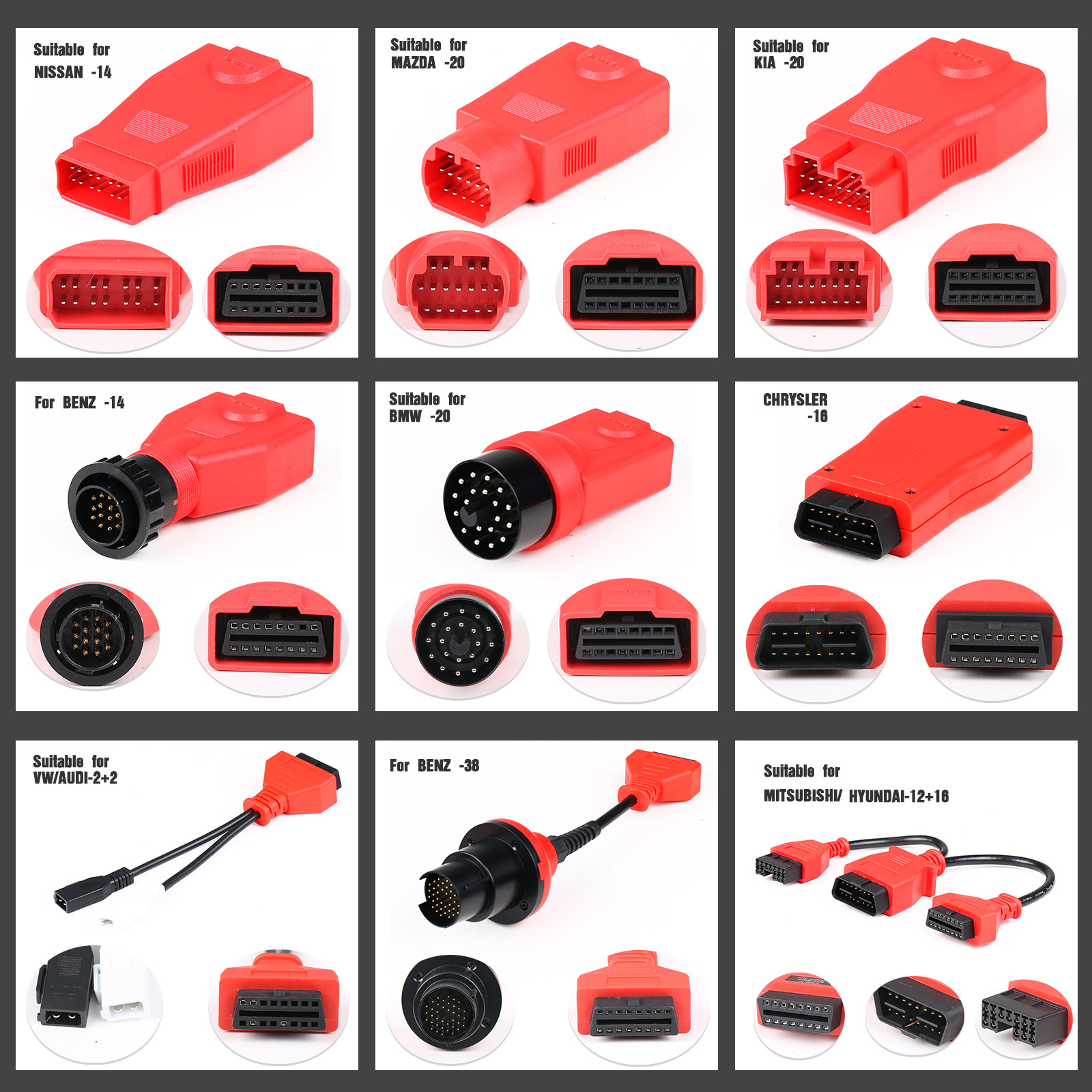 Connectors Included: 9pcs Connectors: For Nis-an-14, Mitsubishi/ Hy-ndai 12+16, Kia-20, BMW-20, Benz-38, VW/Audi-2+2, Mazda-17, Chrysler-16 and Benz-14. A blow-molded carrying case is also included. Please note that there are two blanks in the box: because Fiat-3 and PSA-2 are not included.