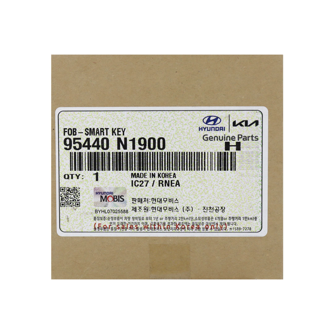 Buttons: 5Frequency: 433MHzColor: SilverPanic: YesRemote Blade: Not IncludedManufacturer: Genuine / OEMCondition: NewOEM Part Number: 95440-N1900Battery: CR2450Proximity / Smart / Keyless Go: YesFCC ID: TQ8-FOB-4F61Region / Market: KoreaTransponder - ID: HITAG 128-bits AES ID4A NCF29AXM