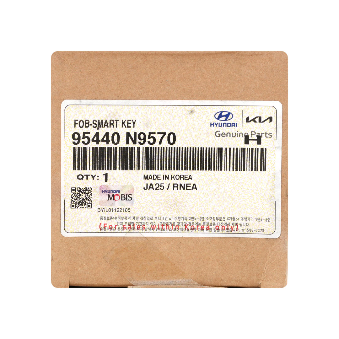 Buttons: 5Frequency: 433MHzColor: SilverPanic: YesRemote Blade: Not IncludedManufacturer: Genuine / OEMCondition: NewOEM Part Number: 95440-N9570Battery: CR2450Proximity / Smart / Keyless Go: YesReusable: NoFCC ID: TQ8-FOB-4F89U44IC: 5074A-FOB4F89U44Transponder - ID: HITAG 128-bits AES ID4A NCF29AXMRegion / Market: Korea