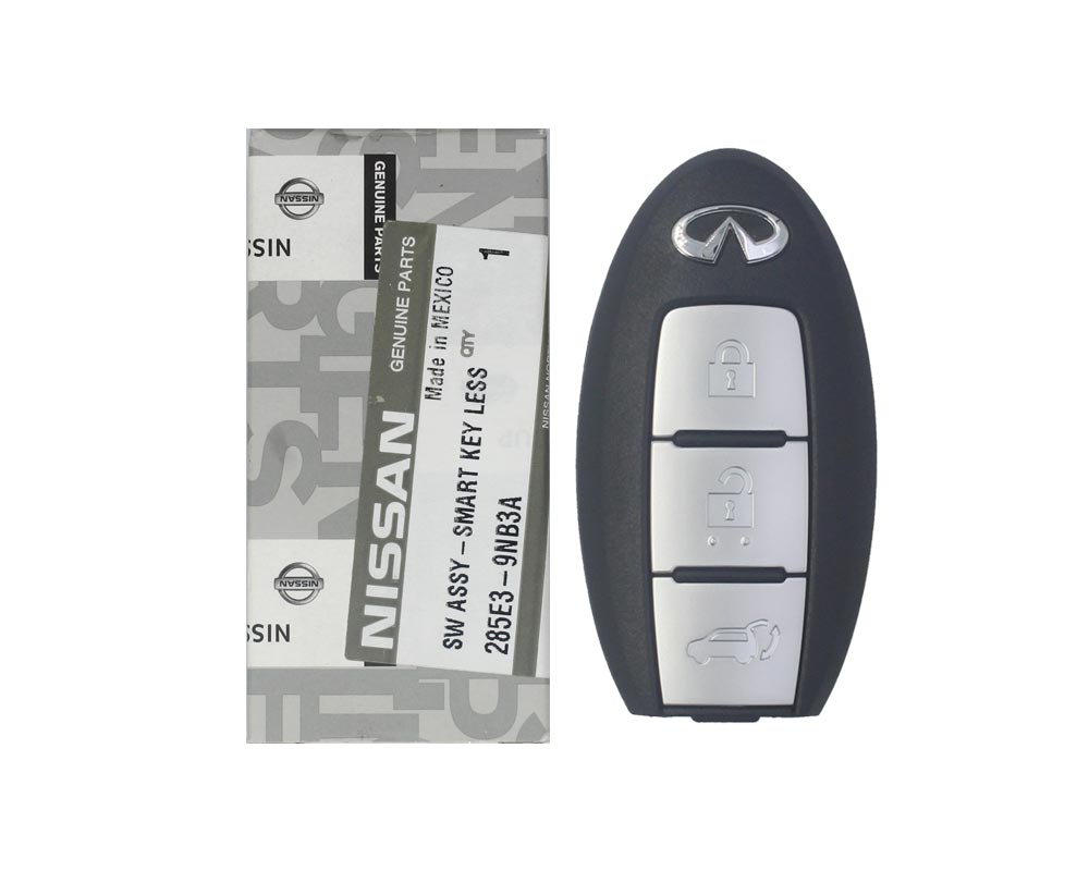 OEM Part Number: 285E3-9NB3ACondition: NewFrequency: 433MHzButtons: 3Color: BlackManufacturer: Genuine / OEMFCC ID: KR5S180144014Proximity / Smart / Keyless Go: YesPanic: Not SpecifiedRemote Blade: Not IncludedBattery: CR2032IC: 7812D-S180014Transponder - ID: HITAG 3 ID47 PCF7953X