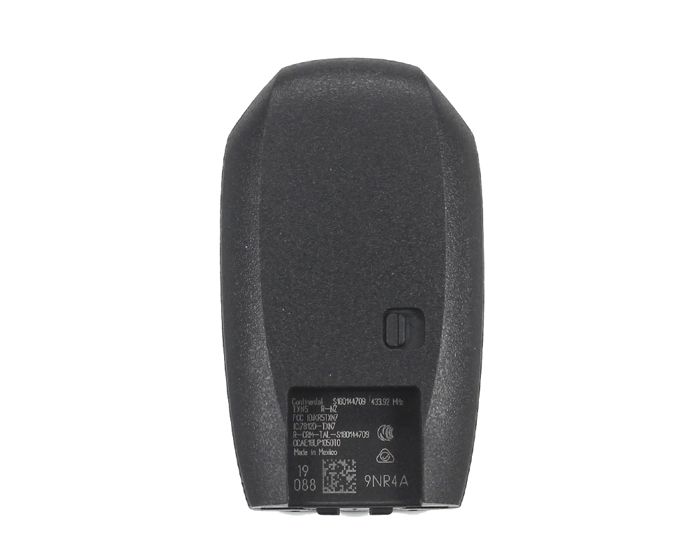 OEM Part Number: 285E3-9NR4ACondition: NewFrequency: 433MHzButtons: 4Panic: YesColor: BlackFCC ID: KR5TXN7Manufacturer: Genuine / OEMProximity / Smart / Keyless Go: YesRemote Blade: Not IncludedBattery: CR2032Region / Market: Middle east & USA & CanadaIC: 7812D-TXN7Continental: S180144709