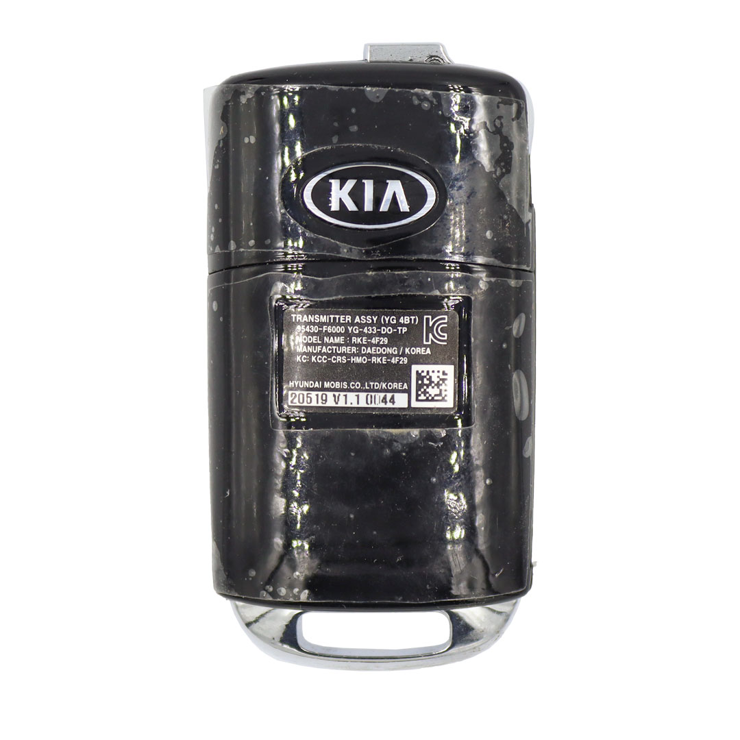 Buttons: 4Frequency: 433MHzColor: BlackPanic: YesRemote Blade: Not IncludedManufacturer: Genuine / OEMCondition: UsedOEM Part Number: 95430-F6000Battery: CR2032Unlocked: YesProximity / Smart / Keyless Go: NoFCC ID: RKE-4F29Region / Market: KoreaTransponder - ID: DST 4D 60