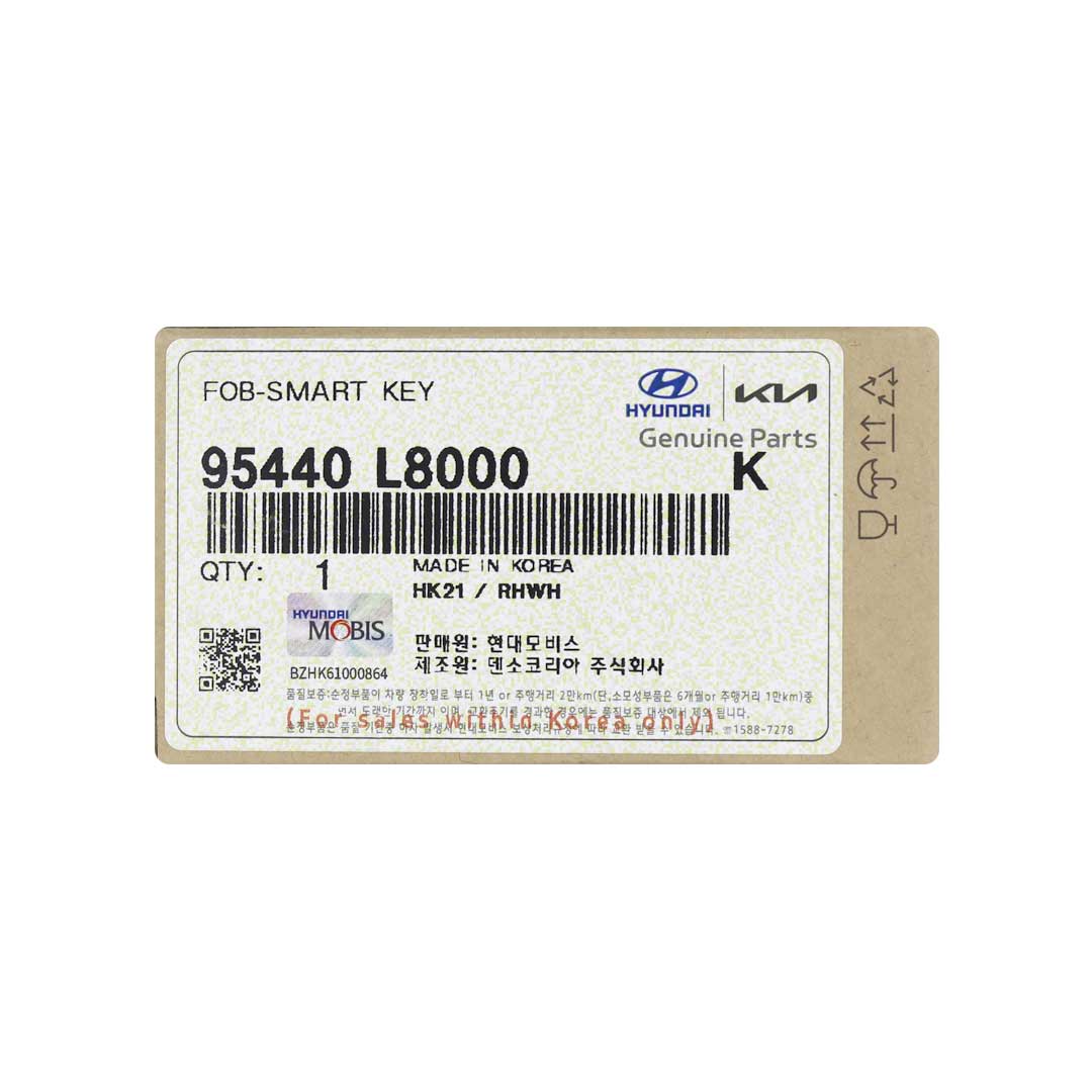 Buttons: 5Frequency: 433MHzColor: Black And SilverPanic: YesRemote Blade: Not IncludedManufacturer: Genuine / OEMCondition: NewOEM Part Number: 95440-L8000Battery: CR2032Proximity / Smart / Keyless Go: YesFCC ID: FD01330Transponder - ID: HITAG 128-bits AES ID4A NCF29AXMRegion / Market: Korea